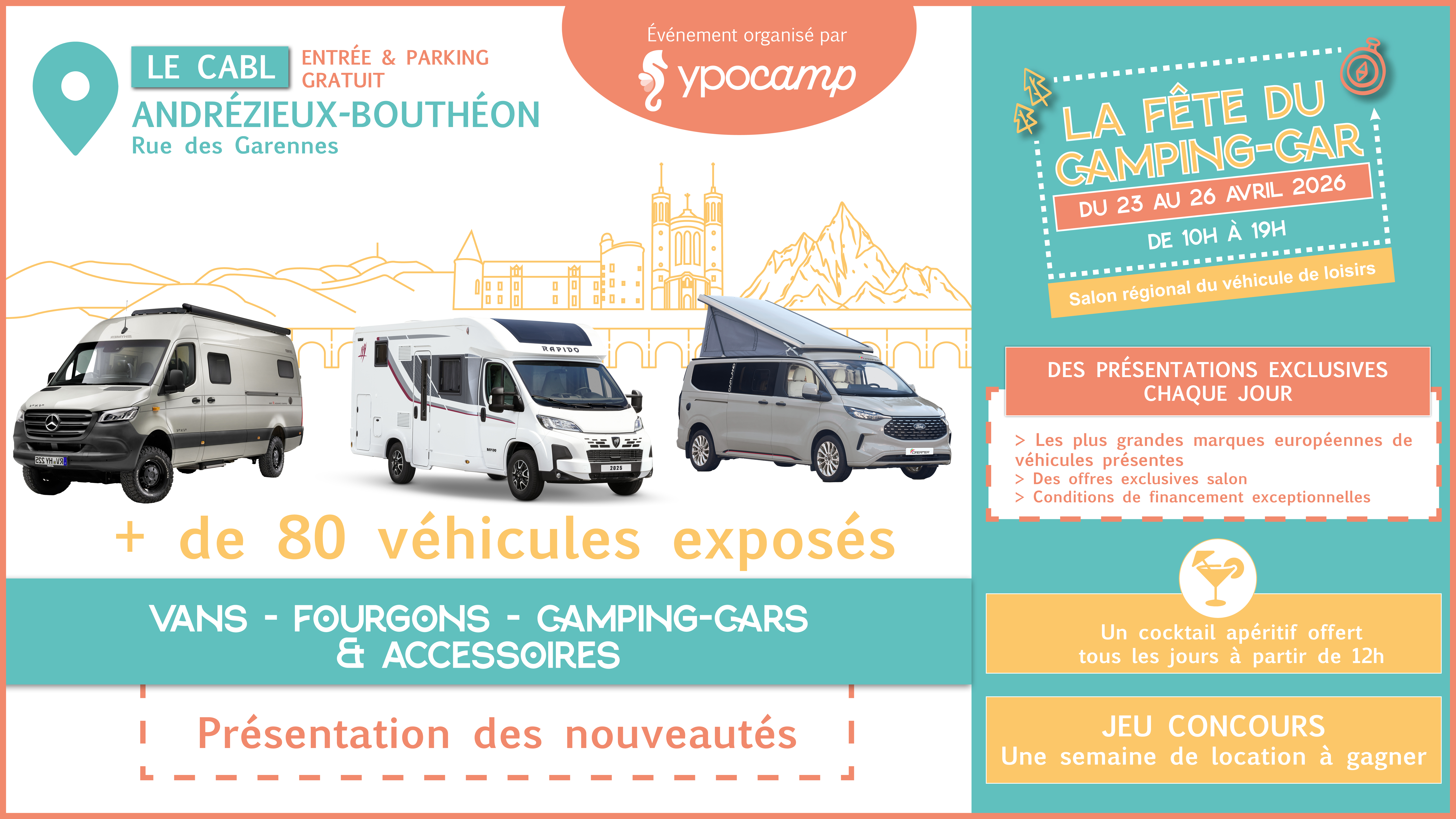 Pendant 4 jours, le CABL à Andrézieux Bouthéon accueillie la concession de véhicules de loisirs Ypocamp Balzac pour présenter toutes les nouveautés dans le monde du voyage en autonomie. Vous découvrirez ainsi des nombreux modèles de véhicules avec des présentations exclusives, des offres spéciales salon sans oublier le jeu concours qui vous permettra de remporte une semaine de location.