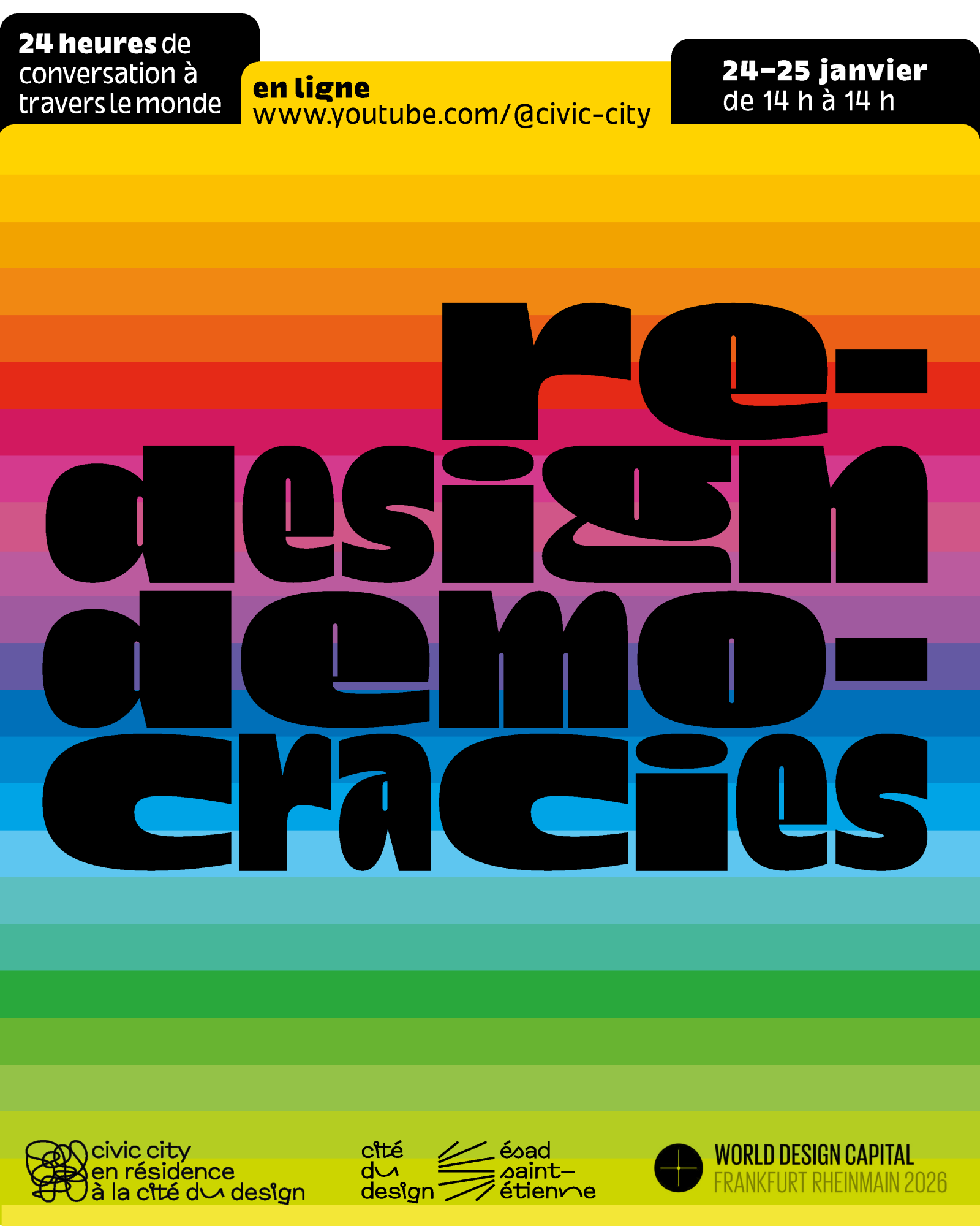 Du samedi 24 au dimanche 25 janvier 2026, l’institut de recherche critique en design Civic city, créé par Ruedi et Vera Baur, organise une émission de 24 heures à travers le monde sur le thème de la démocratie.