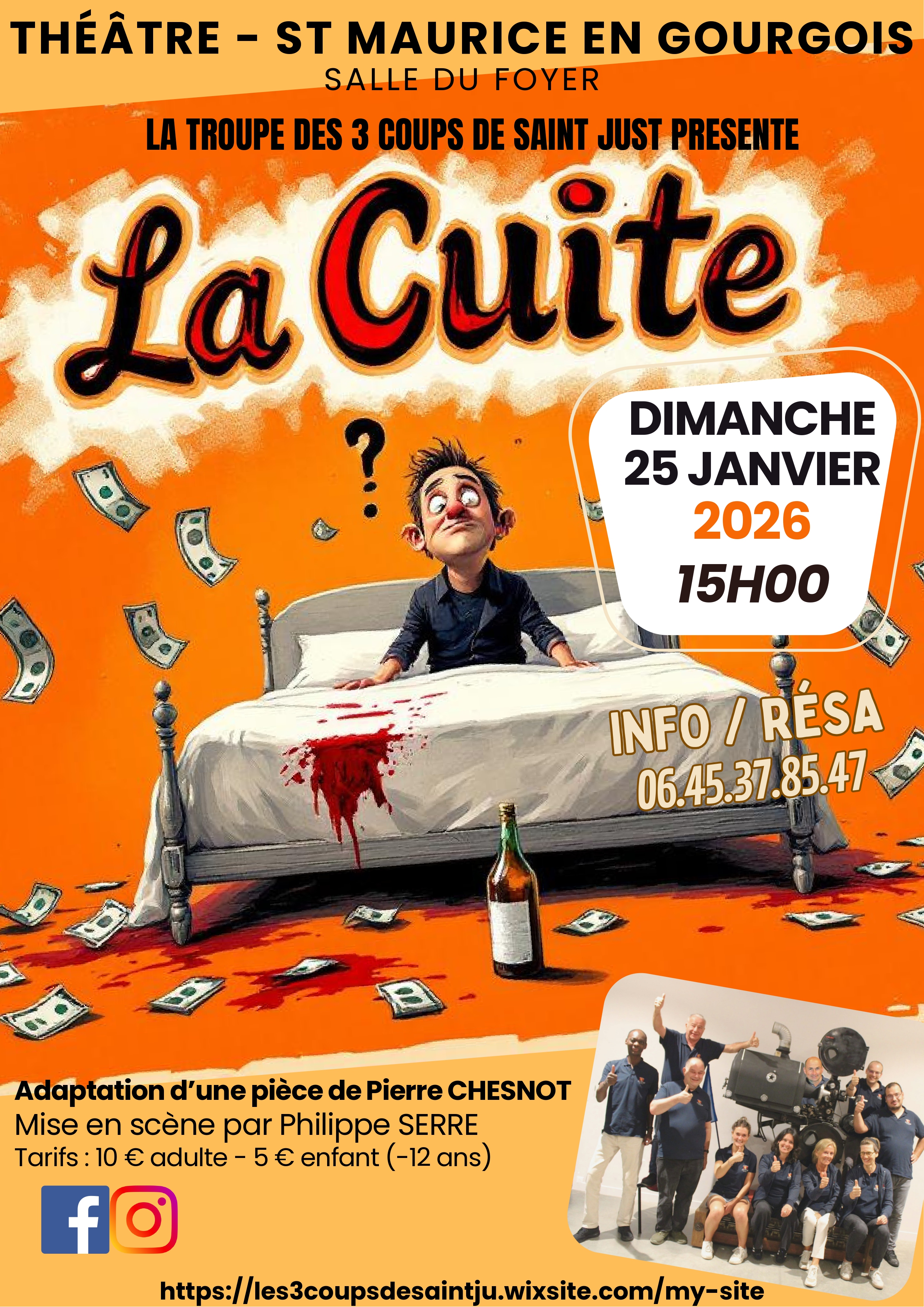 Et en plus, quand on s’habille et qu’on découvre son pantalon tacheté de sang avec une grosse somme d’argent dont on ne connaît pas la provenance, on peut en déduire que la nuit a dû être agitée. Mais que s’est-il passé la veille ? Michel Serpollet devra démêler ce sac de nœuds au cours de cette pièce où les quiproquos et les situations les plus inconfortables s’enchaîneront tambour battant. Venez nombreuses et nombreux savourer une bonne dose de rire et de détente sans modération.